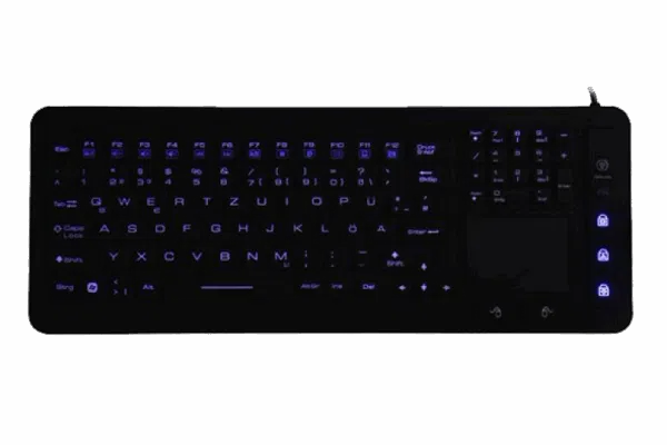 SK311 tastiera industriale in gomma siliconica rigida, 110 tasti e touchpad, USB, protezione a IP68, antibatterica e lavabile, retroilluminata a LED blu, per ambienti medicali, alimentari, industriali gravosi.
